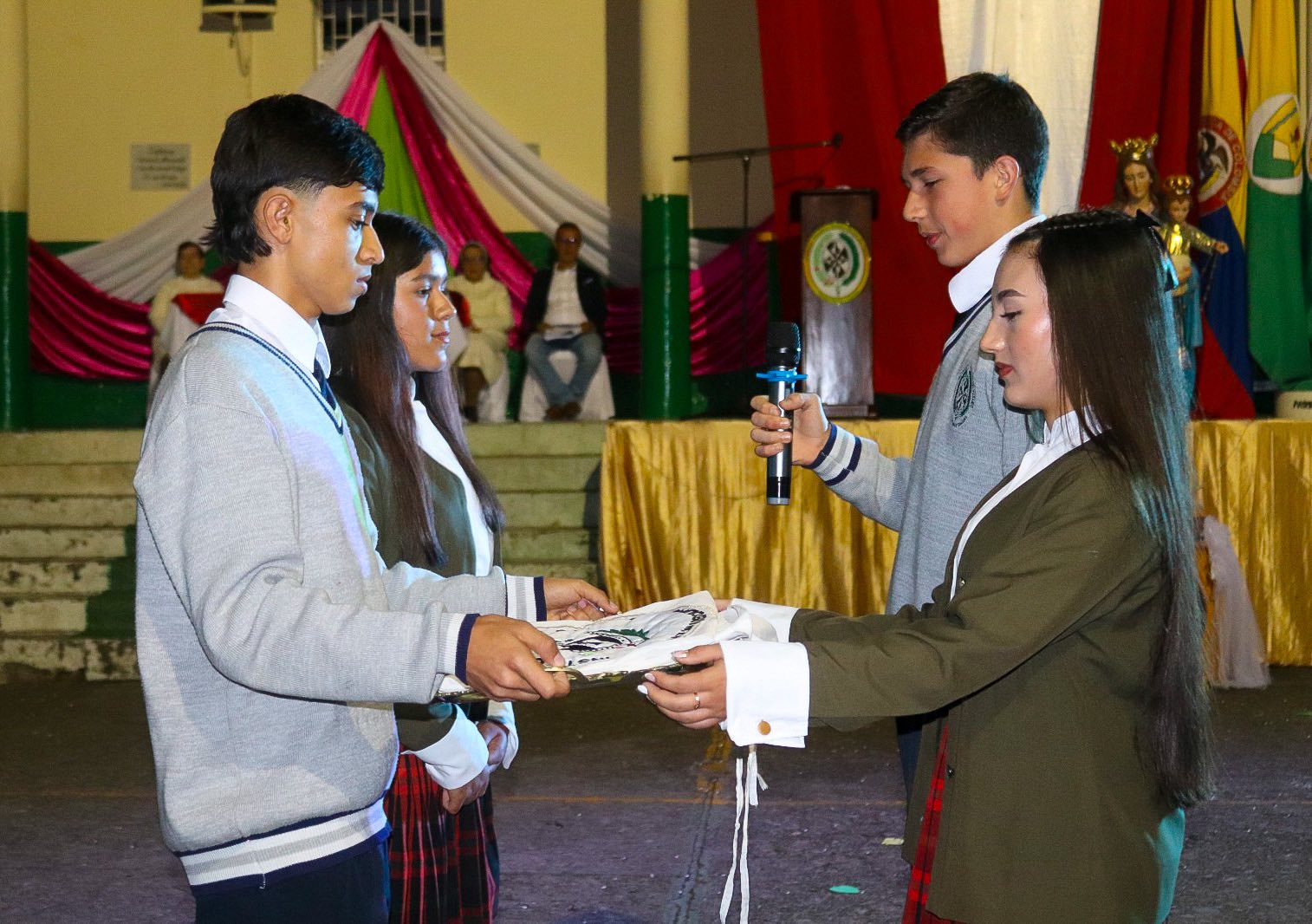 Nuestros estudiantes de undécimo grado entregaron con orgullo y cariño los símbolos más preciados que representan la identidad, los valores y el espíritu del Colegio El Rosario.